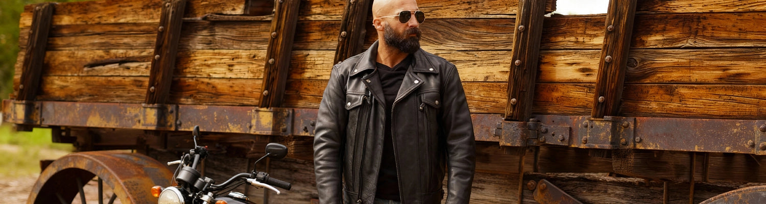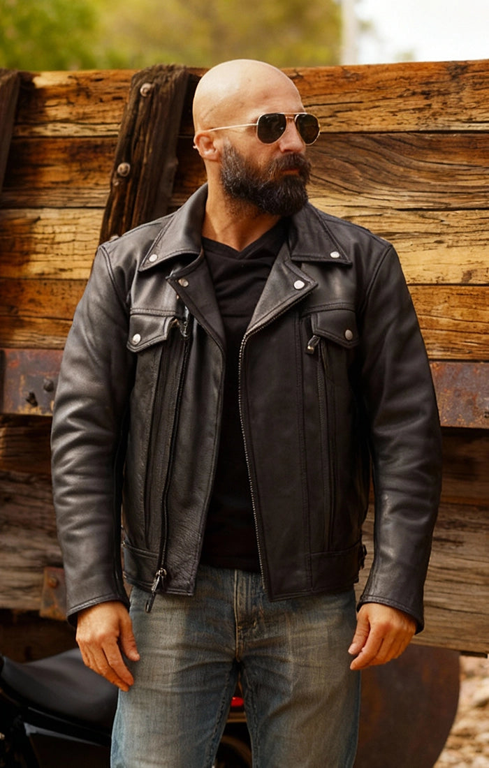 Kent Herren Motorrad-Lederweste und Kapuzenpullover, Schwarz und Grau