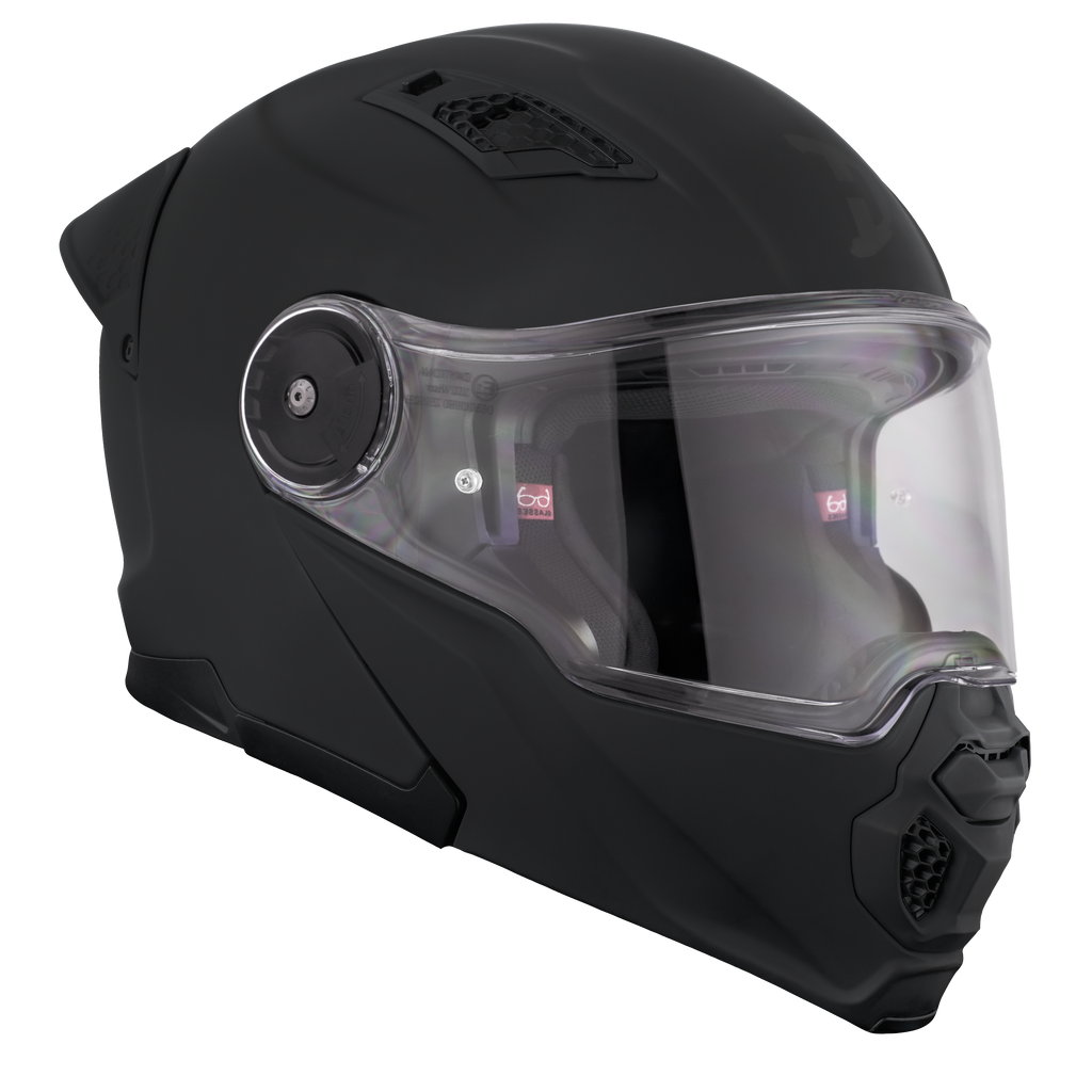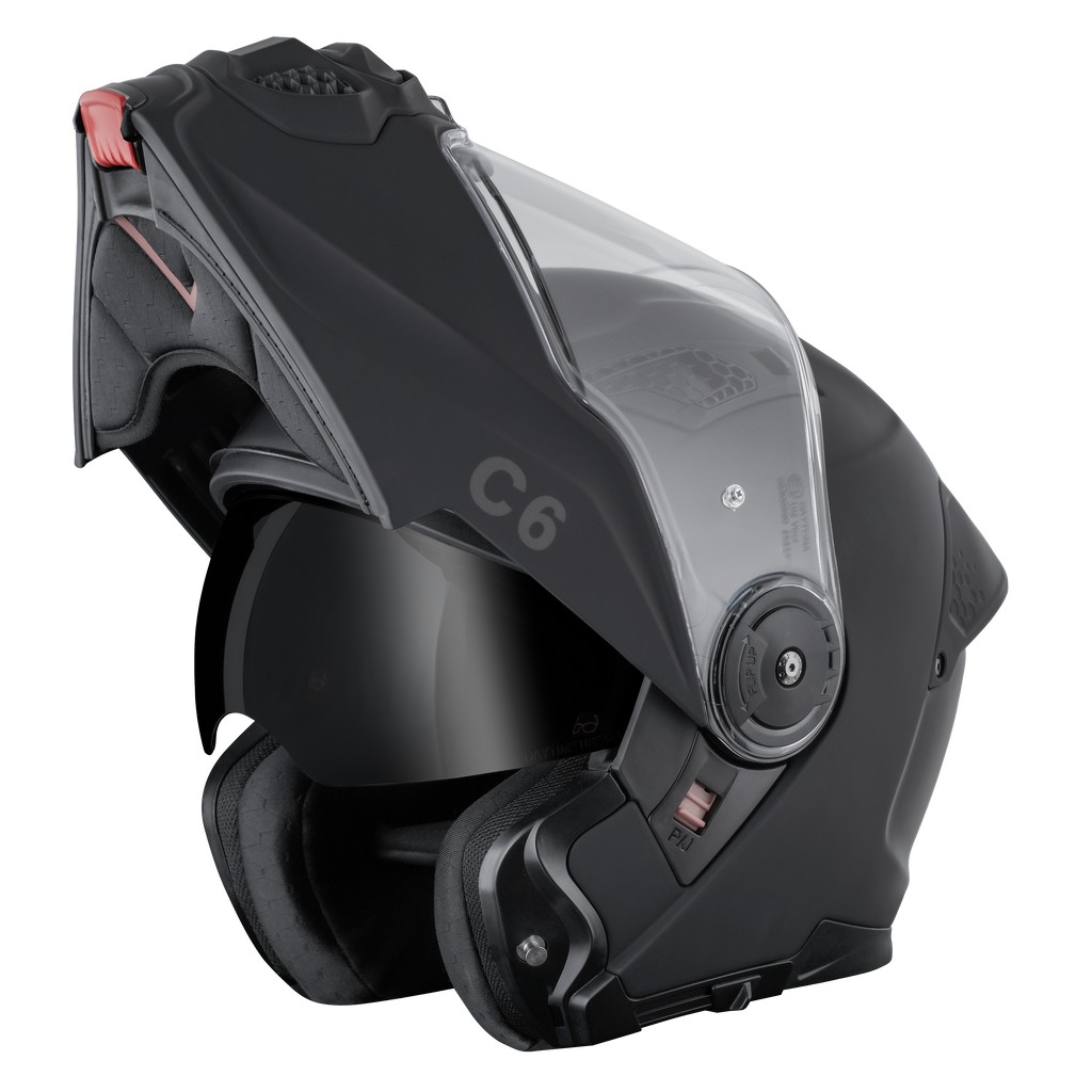 Our D.O.T. And ECE Daytona C6 Modular Helmet, With Inner Anti-Scratch Retractable Smoke Shield, In Dull Black, Meets And Exceeds D.O.T. FMVSS 218 And ECE 22R06 Standards.  With 2 Different Shell Sizes (XS-M/L-2XL), You're Sure To Get That Proportionate Fit!!  Features A Dual Shield System; Outer Anti-Scratch Clear Shield With OptiVision 200 Lens (Anti-Fog) And Inner Anti-Scratch Retractable Smoke Shield.  Also Has A Quick Release Lock Retention System; One Finger Release Lever For Easy Detachment, Adjustable Chin And Forehead Ventilation, A Removable Aerodynamic Visor And A Removable, Hand Washable Interior (Moisture Wicking Fabric). Bluetooth Compatible.  Cloth Draw String Bag Included.  Sizes Range From XS-2XL.