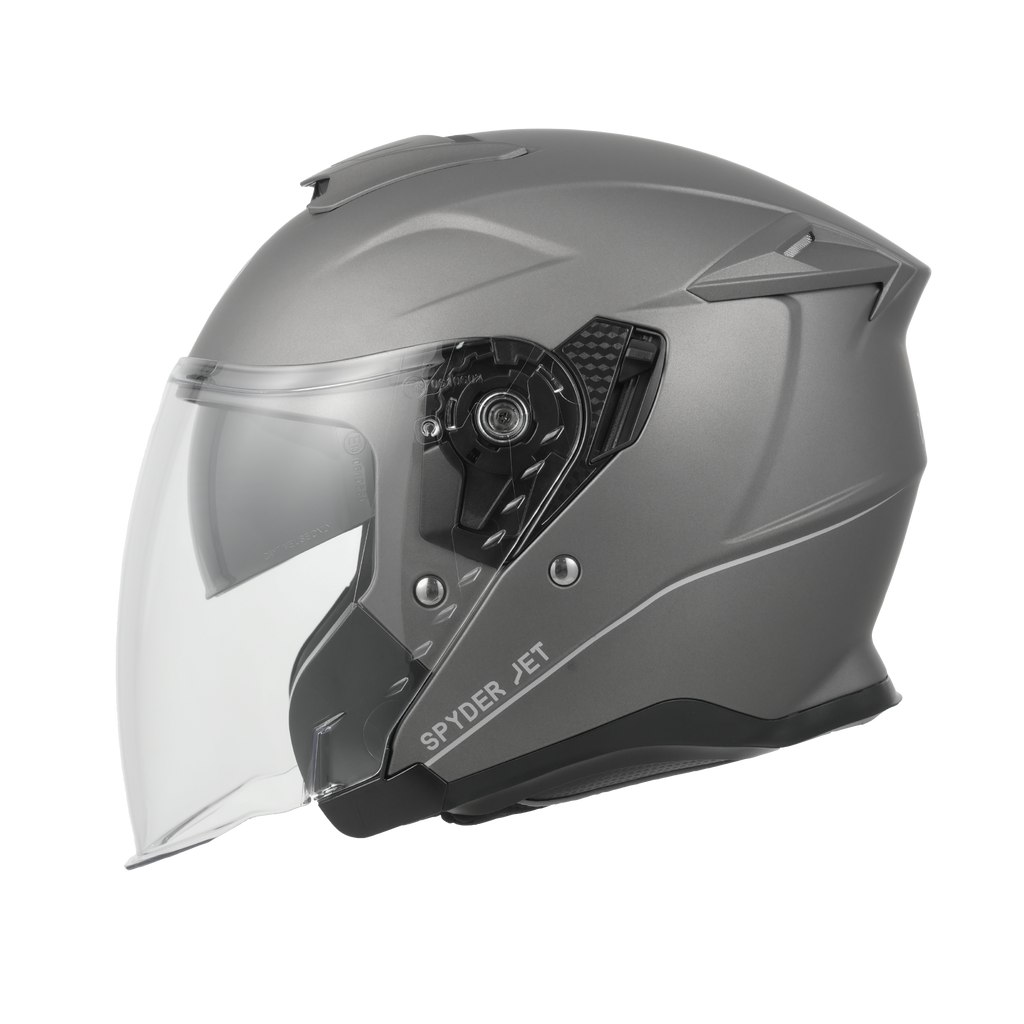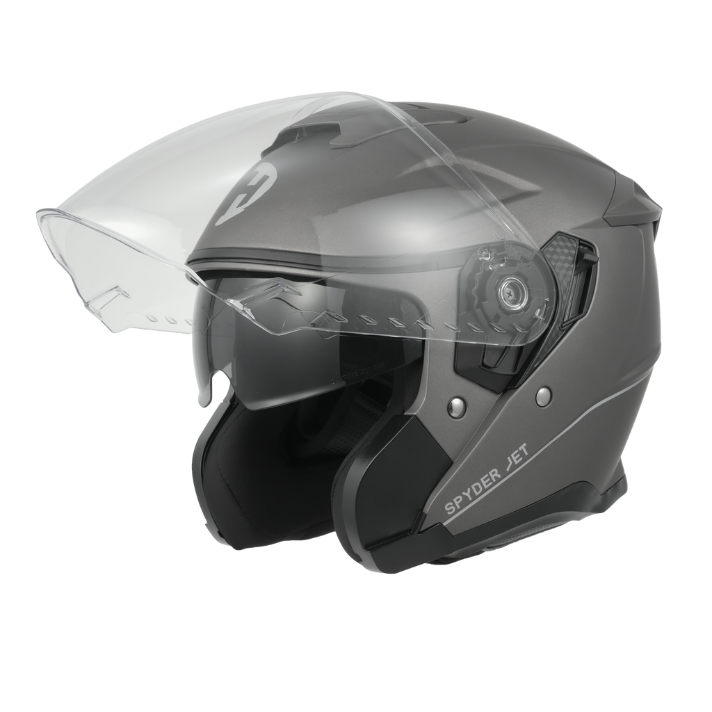Our D.O.T. And ECE Daytona Spyder Jet Helmet In The Gun Metal Grey Dull Metallic Finish, Meets And Exceeds D.O.T. FMVSS 218 And ECE 22R06 Standards!!  Features A Dual Shield System; Outer Anti-Scratch Clear Shield And Inner Anti-Scratch Retractable Smoke Shield.  Also Has A Quick Release Lock Retention System; One Finger Release Lever For Easy Detachment And A Removable, Hand Washable Interior (Moisture Wicking Fabric).  Bluetooth Compatible. Cloth Draw String Bag Included.  Sizes Range From XS-2XL.