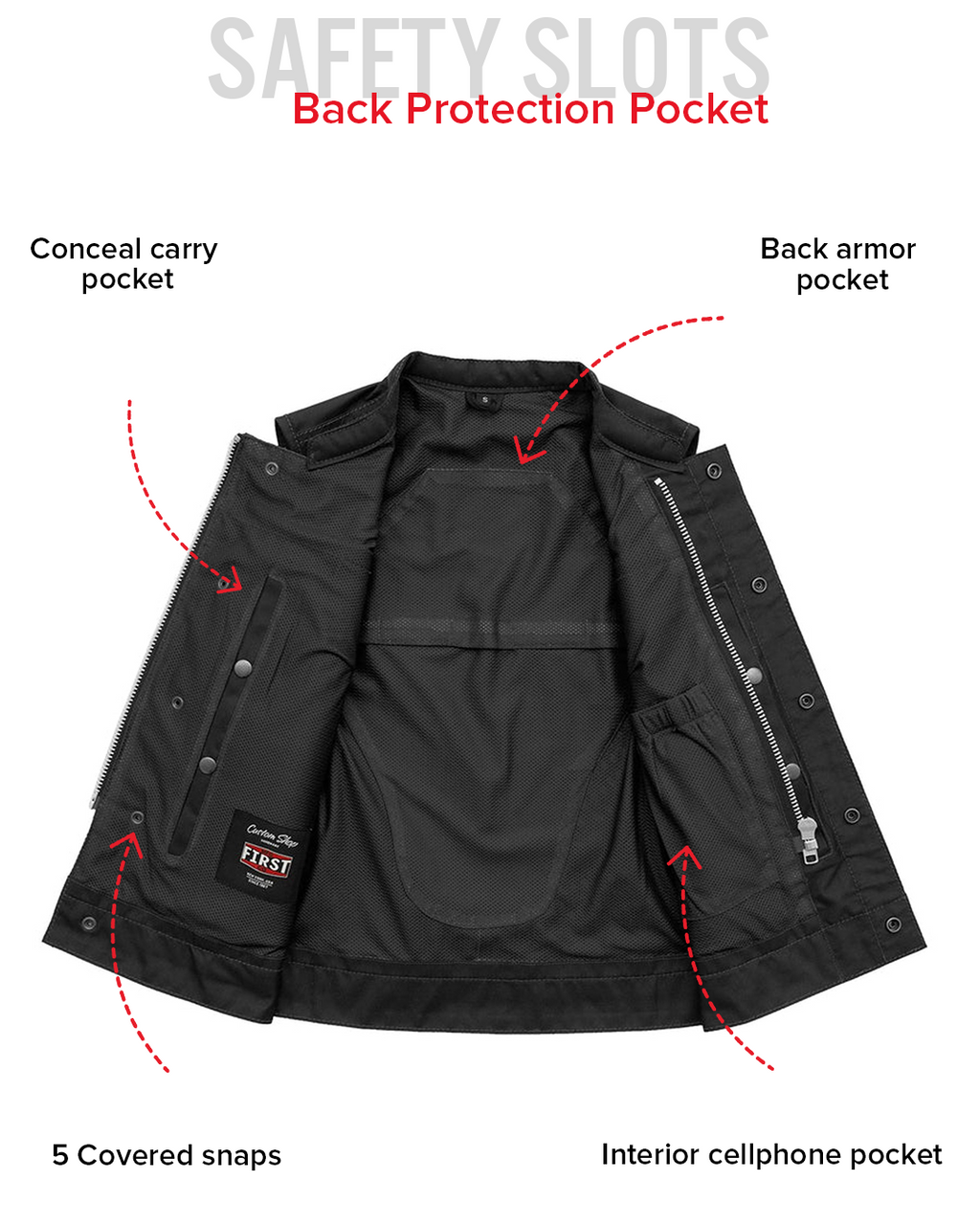 • Club style vest with one-inch collar, covered snaps and hidden cropped center zipper