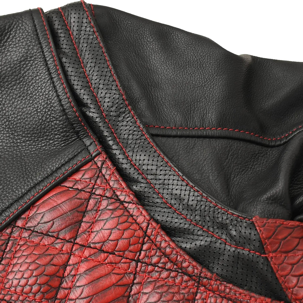 Meet the Redstrike, a bold motorcycle leather jacket built for riders who want performance and unmistakable style. This jacket combines black drum-dyed cowhide with a striking red diamond-quilted body for a look that stands out on every ride. The Redstrike includes conceal carry pockets, armor pockets, a comfortable action back, underarm vents, and a breathable mesh lining with custom paisley print. Whether you’re on the highway or cruising through town, this jacket delivers premium comfort, durability, and attitude.