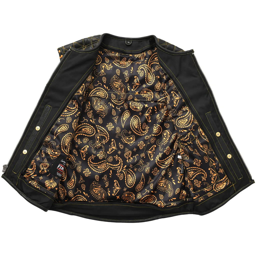 The diamond-stitched shoulders, hand-braided trim, and reinforced seams elevate the overall look. Inside, the satin green paisley liner gives the vest a custom builder vibe. This piece is designed for riders who want comfort, durability, and signature style.