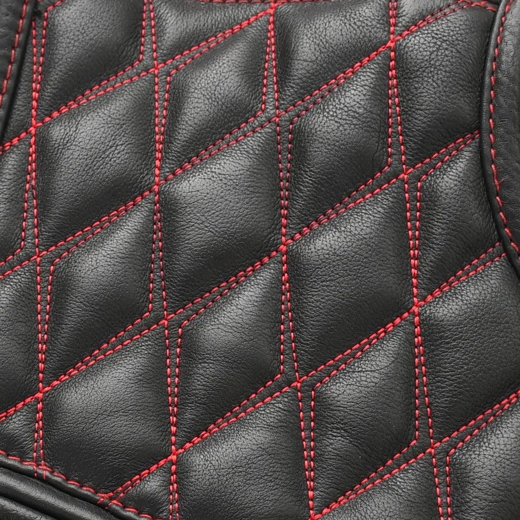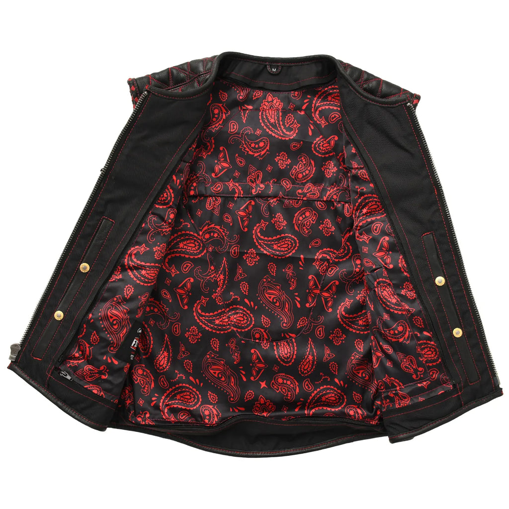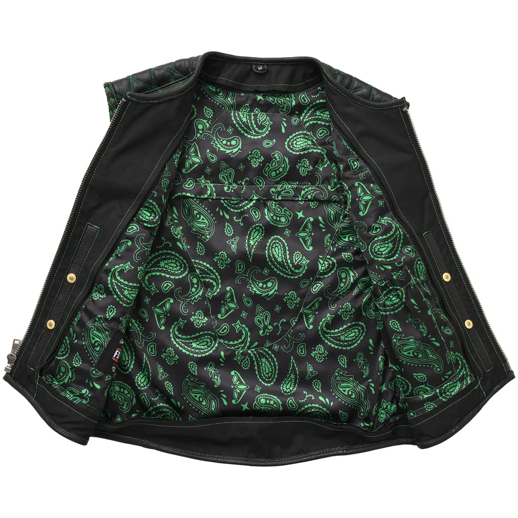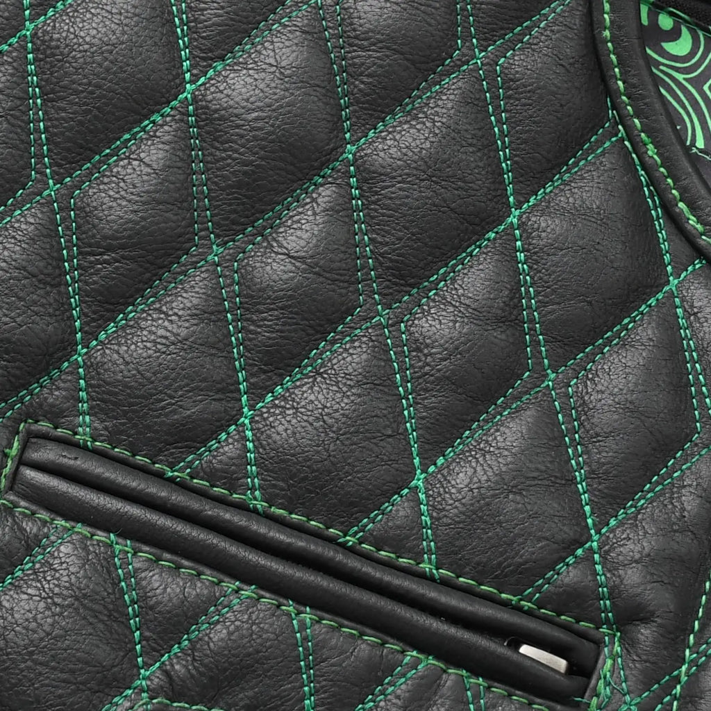 Tactical Emerald is a standout custom style vest built for riders who want performance with a bold visual edge. This vest blends premium black leather with deep emerald accents, quilt stitching, stretch rib panels, and a striking paisley liner. It offers a highly adjustable fit, strong side straps, and plenty of storage options, making it ideal for long rides, club events, or everyday street use.