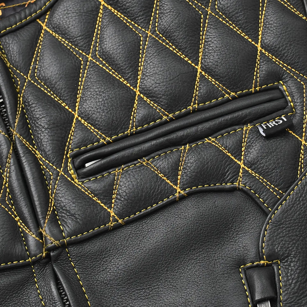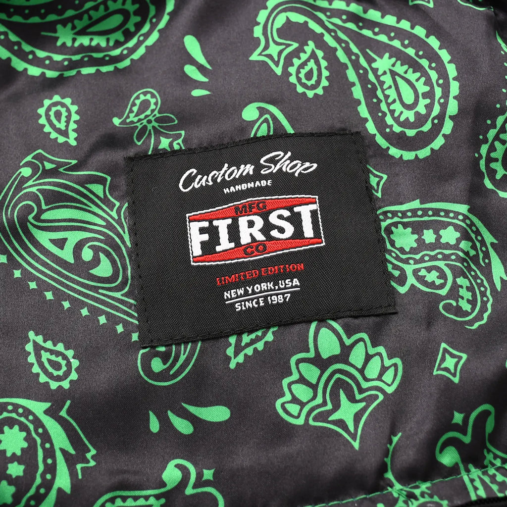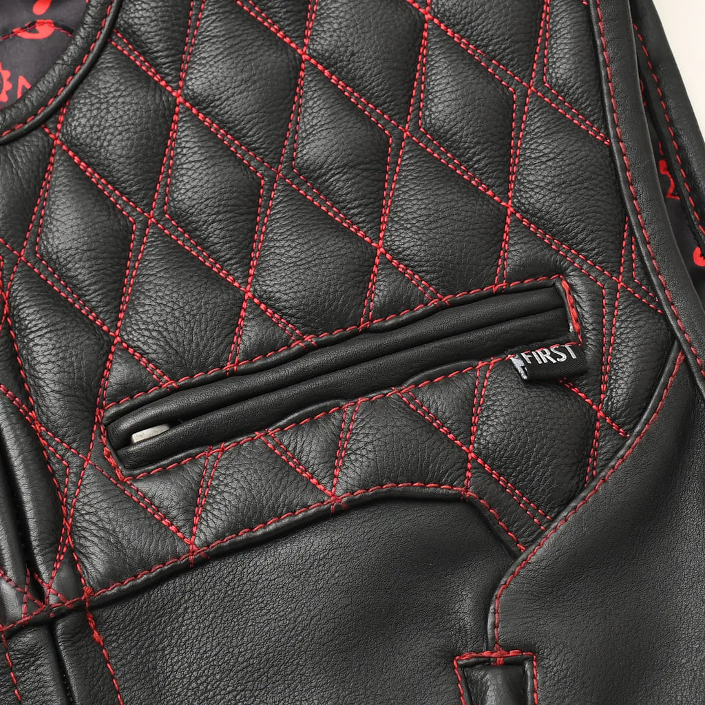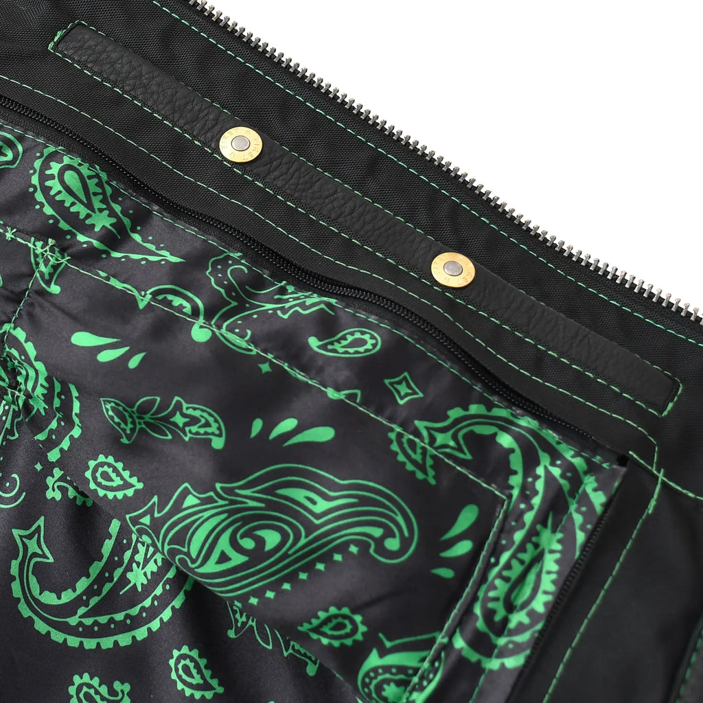Tactical Emerald is a standout custom style vest built for riders who want performance with a bold visual edge. This vest blends premium black leather with deep emerald accents, quilt stitching, stretch rib panels, and a striking paisley liner. It offers a highly adjustable fit, strong side straps, and plenty of storage options, making it ideal for long rides, club events, or everyday street use.